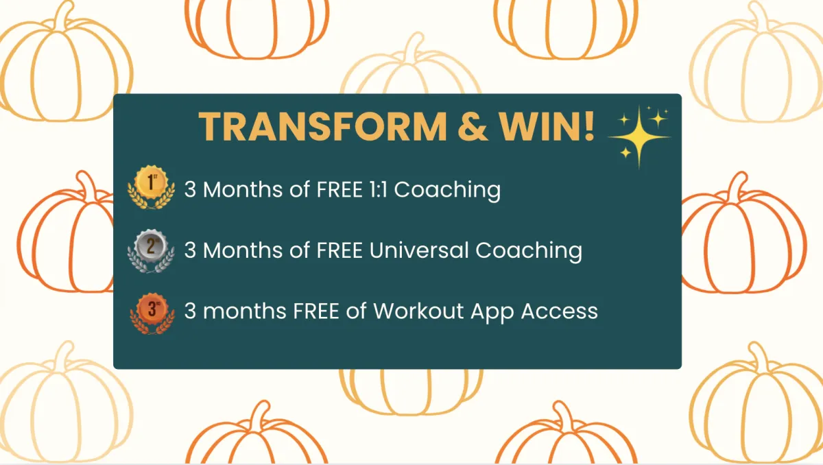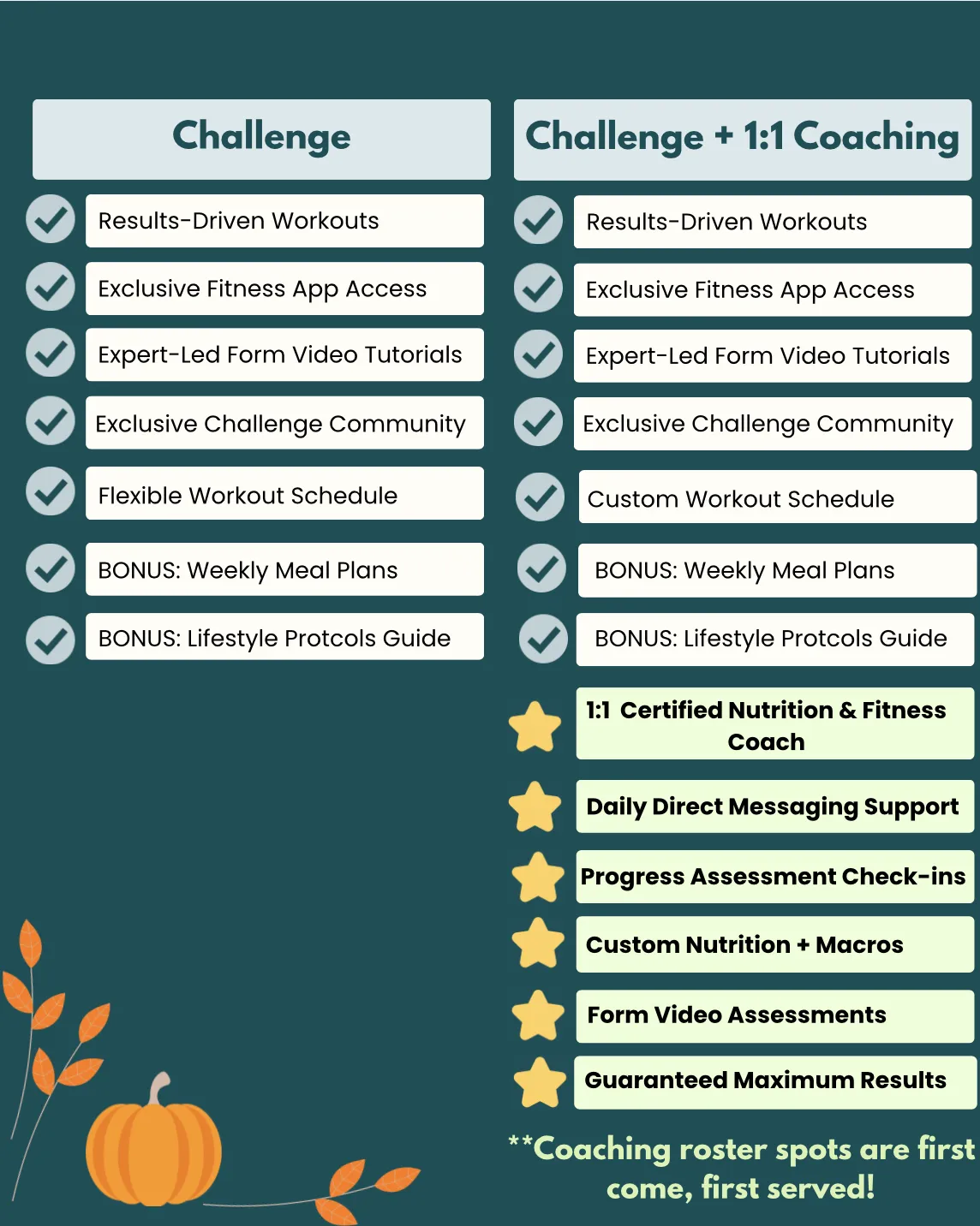 This challenge includes the exclusive opportunity to work directly with your very own 1:1 Transformation Coach. Every step of your journey is personalized to your unique goals, challenges, and lifestyle. Youโll receive daily support and individualized coaching designed to keep you consistently moving forward. With weekly accountability check-ins, your coach will review your progress, answer your questions, boost your motivation, and make precise adjustments as needed to ensure you stay on track. Beyond that, youโll gain access to a fully customized program including personalized nutrition guidance and macros, tailored workout scheduling, form video feedback, and powerful strategies for overcoming obstacles. This is next-level coaching that provides the structure, accountability, and expert attention you need to experience real transformation!๐คฉ